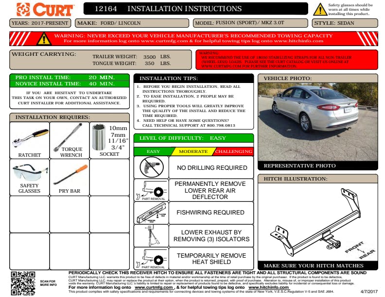 A CURT trailer hitch is the key to pursuing your passions, whether you're taking the family boat out for an afternoon on the water or packing up the mountain bikes for a day on the trails. This CURT class 2 hitch is perfect for towing a small trailer, such as a boat trailer, lightweight camper or utility trailer. It can also be used to mount a hitch cargo carrier or bike rack (never exceed the lowest-rated towing component). Like all CURT custom hitches, this class 2 trailer hitch is made for a vehicle-specific fit. It is engineered to seamlessly integrate with select years of the Ford Fusion and Lincoln MKZ (see application info to verify fitment). It is rated for 3,500 pounds gross trailer weight and 350 pounds tongue weight. It is also equipped with 1-1/4" x 1-1/4" hitch receiver to accept the included ball mount. The ball mount that comes with this hitch kit has a 3/4" trailer ball hole and can be positioned in the drop or rise orientation for level towing with your specific trailer (trailer ball not included). Like all CURT custom receiver hitches, this class 2 hitch is designed, manufactured, finished and tested with the utmost care. It is engineered for a precise fit, easy installation, maximum towing strength and an integrated look on the vehicle. It is also tested to SAE J684 protocols for safety. This class 2 trailer hitch is finished with our industry-leading dual-coat process for unparalleled rust, chip and UV resistance. It is descaled for a smooth surface, submersed in liquid A-coat for rust prevention inside and out, covered with a highly durable powder coat, and finally co-cured for a dependable shield against the elements. This class 2 hitch comes with a ball mount, hitch pin and mounting hardware for a complete installation.