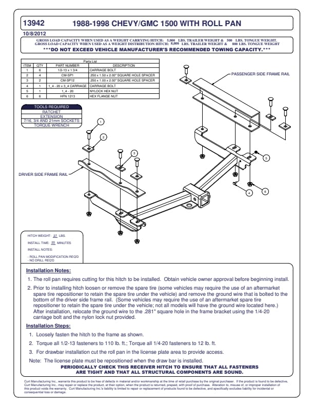 Whatever your task at hand -- whether it's launching that boat before daybreak, setting up your camper before the rush or getting a final load to the dump before close -- CURT class 3 trailer hitches offer the strength needed for serious towing. They make it easy to hitch up and Bring It, offering a vehicle-specific fit and the weight capacity to handle a variety of trailers. Custom class 3 hitches are the most common type of receiver hitch for pickup trucks and SUVs. Because of their weight range, they are also found on full-size cars, crossovers and minivans. Each custom-fit class 3 hitch package is made for vehicle-specific mounting. This particular kit fits certain years of the Chevy C1500 or K1500 and GMC C1500 or K1500 (see application info to verify vehicle compatibility). It provides a weight carrying capacity of 5,000 lbs. GTW and 500 lbs. TW. It is also compatible with a weight distribution hitch for level towing and a rating of 8,000 lbs. WD and 800 lbs. WDTW. CURT class 3 trailer hitches are typically used to attach and haul utility trailers, boat trailers, campers, snowmobile or ATV haulers and more (NOTE: Never exceed the lowest-rated towing component). Each class 3 hitch has a 2" receiver tube and is tested in accordance with SAE J684 for safety. To ensure that CURT class 3 receiver hitches have what it takes for serious trailering, they are designed using a hands-on approach and are constructed with rugged, high-strength steel and precise welding. We also protect our class 3 hitches in a co-cured finish of liquid A-coat and black powder coat for superior resistance to rust, chipping and UV damage.