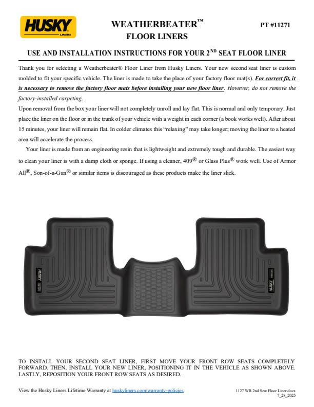 - WeatherBeater(TM) Liners offer protection that extends all the way to your rear seats. So go ahead, lift the seats and leave them up, load after load. Husky's got your floors, and your back, no matter what the road brings your way.