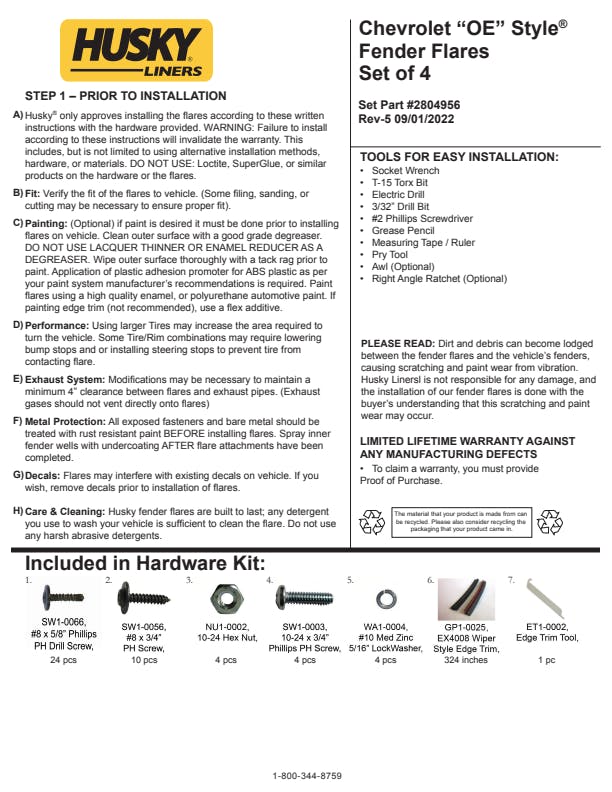 - OE Style fender flares are covered by Husky Liners Limited Lifetime Warranty. Featuring Husky's legendary durability, so they're built to last. Proudly made in the USA with global materials.