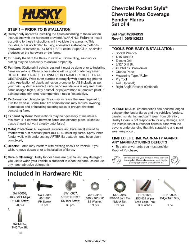 - Pocket Style Fender Flares are covered by Husky Liners Limited Lifetime Warranty, featuring Husky's legendary durability, so they're built to last. Proudly made in the USA with global materials.
