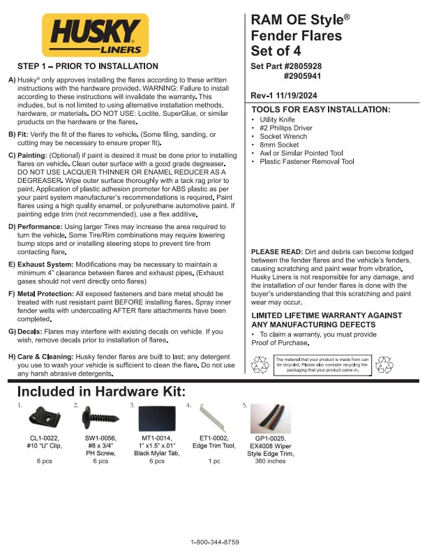 - OE Style fender flares are covered by Husky Liners Limited Lifetime Warranty. Featuring Husky's legendary durability, so they're built to last. Proudly made in the USA with global materials.