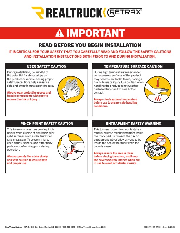 With over one million units sold worldwide, the RealTruck® RetraxPRO MX tonneau cover returns with the strongest, smoothest, and most-refined release yet. Built for serious durability and everyday utility, the premium retractable truck bed cover delivers unmatched security, all-weather protection, and flexible cargo control—no matter where you’re trekking or what you’re hauling. At its core, the RetraxPRO MX features a durable double-wall aluminum slat surface engineered for superior strength and security. Designed to support up to 500 lbs. of evenly distributed weight, this bed cover offers confidence whether hauling gear below, on top, or both. A factory-grade matte black powder coat resists scratches while complementing your truck’s finish. Opening and closing the cover is effortless thanks to the exclusive CoreTrax™ sealed rollers and the key-lockable TraxLatch™ comfort handle. With infinite positioning, the TraxLatch system allows the cover to be held open in any configuration along the bed—and even lets you secure gear between the cover and tailgate for added versatility. Best of all, the cover opens and closes independently of the tailgate, so you can access your gear without dropping it. Engineered and tested for use in extreme conditions, the RetraxPRO MX performs reliably in temperatures from -40 to 180°F and up to 95 percent humidity. Specialty components resist freezing and binding, ensuring effective operation in all weather conditions. An all-new water management system seals tightly and channels excess moisture through integrated drain tubes, helping keep cargo protected and dry. A reinforced storage canister with fortified ends adds strength and durability, while updated packaging ships in a single box for easier handling. The RetraxPRO MX is assembled in the USA and backed by a lifetime warranty. Installation is quick and easy with the clamp-on rails—requiring no modifications and only 60 minutes of your time.