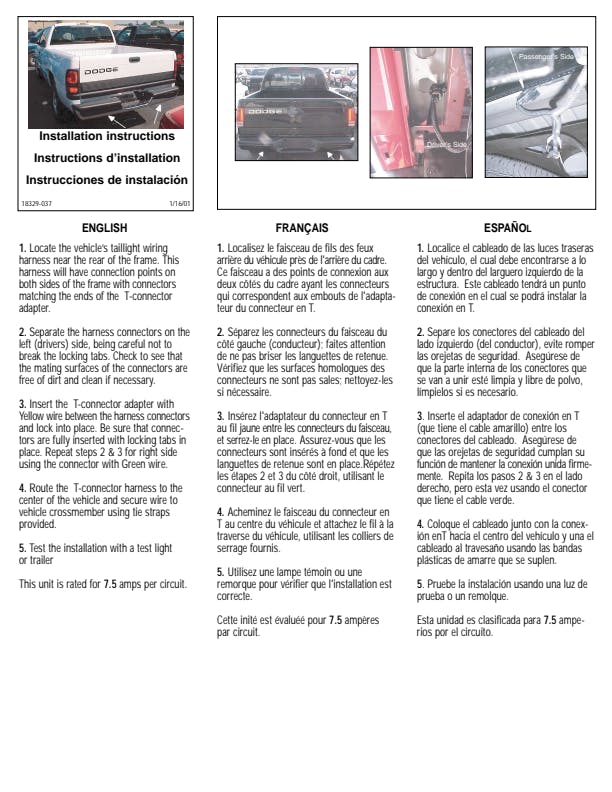 T-One Connectors require no splicing of vehicle wires. Simply locate your vehicles wiring harness connector, unplug the connection and insert the T-One Connector into the vehicle's harness. No special tools required. Factory appearanceQuick and easy installationSolid, weatherproof, one-piece constructionNo cutting, splicing or taping of vehicle wiresIncludes converter where needed16 gauge bonded wire with 4-Flat plug & capStop/Turn circuit capacity of 4.2 AmpsTaillight circuit capacity of 7.5 Amps1 year limited warrantyStop/Turn circuit capacity of 7.5 Amps