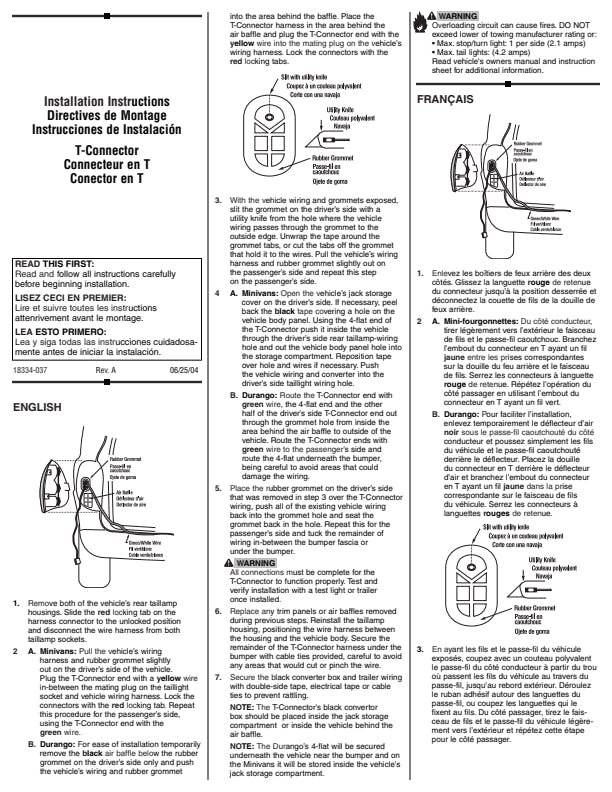 T-One Connectors require no splicing of vehicle wires. Simply locate your vehicles wiring harness connector, unplug the connection and insert the T-One Connector into the vehicle's harness. No special tools required. Factory appearanceQuick and easy installationSolid, weatherproof, one-piece constructionNo cutting, splicing or taping of vehicle wiresIncludes converter where needed16 gauge bonded wire with 4-Flat plug & capStop/Turn circuit capacity of 4.2 AmpsTaillight circuit capacity of 7.5 Amps1 year limited warrantyStop/Turn circuit capacity of 2.1 Amps
