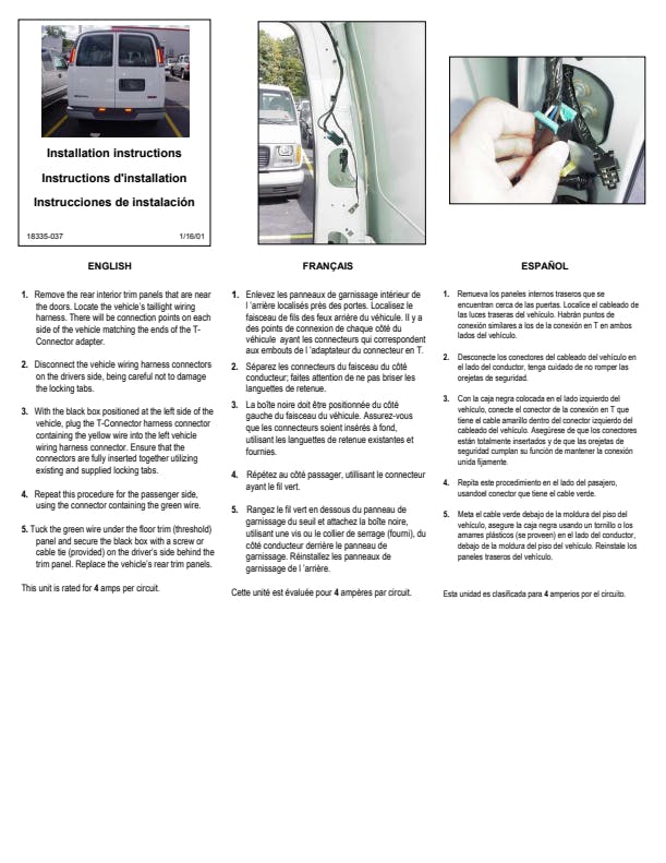 T-One Connectors require no splicing of vehicle wires. Simply locate your vehicles wiring harness connector, unplug the connection and insert the T-One Connector into the vehicle's harness. No special tools required. Factory appearanceQuick and easy installationSolid, weatherproof, one-piece constructionNo cutting, splicing or taping of vehicle wiresIncludes converter where needed16 gauge bonded wire with 4-Flat plug & capStop/Turn circuit capacity of 4.2 AmpsTaillight circuit capacity of 7.5 Amps1 year limited warrantyStop/Turn circuit capacity of 2.1 Amps