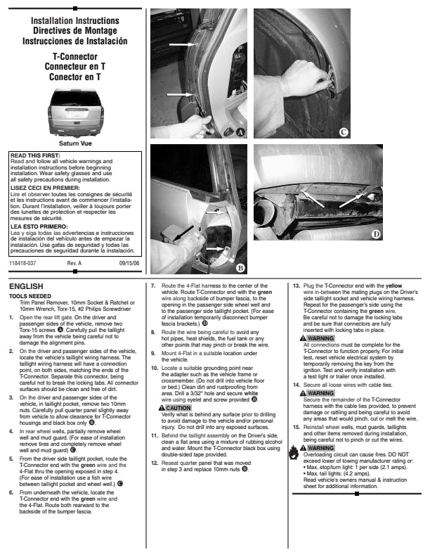 T-One Connectors require no splicing of vehicle wires. Simply locate your vehicles wiring harness connector, unplug the connection and insert the T-One Connector into the vehicle's harness. No special tools required. Factory appearanceQuick and easy installationSolid, weatherproof, one-piece constructionNo cutting, splicing or taping of vehicle wiresIncludes converter where needed16 gauge bonded wire with 4-Flat plug & capStop/Turn circuit capacity of 4.2 AmpsTaillight circuit capacity of 7.5 Amps1 year limited warrantyStop/Turn circuit capacity of 2.1 Amps