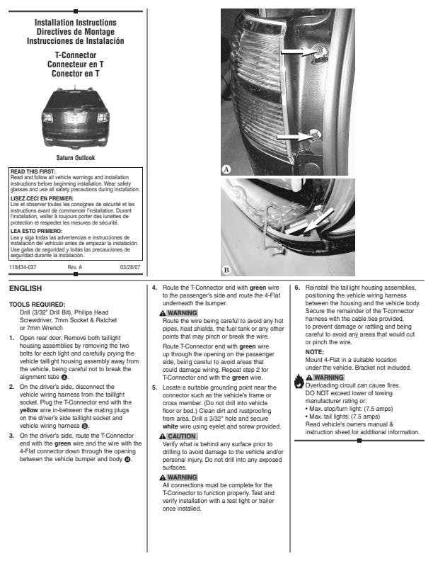 T-One Connectors require no splicing of vehicle wires. Simply locate your vehicles wiring harness connector, unplug the connection and insert the T-One Connector into the vehicle's harness. No special tools required. Factory appearanceQuick and easy installationSolid, weatherproof, one-piece constructionNo cutting, splicing or taping of vehicle wiresIncludes converter where needed16 gauge bonded wire with 4-Flat plug & capStop/Turn circuit capacity of 4.2 AmpsTaillight circuit capacity of 7.5 Amps1 year limited warrantyStop/Turn circuit capacity of 7.5 Amps