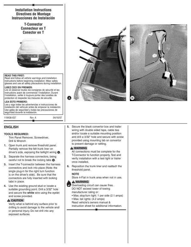 T-One Connectors require no splicing of vehicle wires. Simply locate your vehicles wiring harness connector, unplug the connection and insert the T-One Connector into the vehicle's harness. No special tools required. Factory appearanceQuick and easy installationSolid, weatherproof, one-piece constructionNo cutting, splicing or taping of vehicle wiresIncludes converter where needed16 gauge bonded wire with 4-Flat plug & capStop/Turn circuit capacity of 4.2 AmpsTaillight circuit capacity of 7.5 Amps1 year limited warrantyStop/Turn circuit capacity of 2.1 Amps