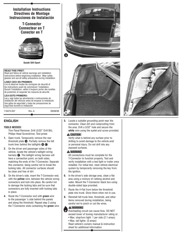 T-One Connectors require no splicing of vehicle wires. Simply locate your vehicles wiring harness connector, unplug the connection and insert the T-One Connector into the vehicle's harness. No special tools required. "Factory" appearanceQuick and easy installationSolid, weatherproof, one-piece constructionNo cutting, splicing or taping of vehicle wiresIncludes converter where needed16 gauge bonded wire with 4-Flat plug & capJust plug in the T-One Connector and you're ready to towSimple do-it-yourself instructions in every packageAttractive Point-of-Purchase PackagingStop/Turn circuit capacity of 2.1 AmpsTaillight circuit capacity of 5 Amps1 year limited warranty