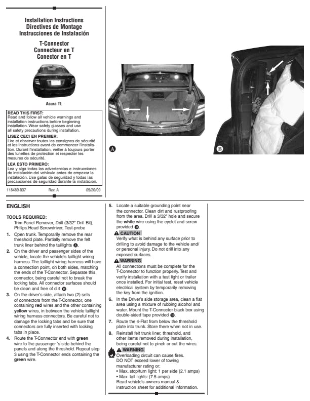 T-One Connectors require no splicing of vehicle wires. Simply locate your vehicles wiring harness connector, unplug the connection and insert the T-One Connector into the vehicle's harness. No special tools required. Factory appearanceQuick and easy installationSolid, weatherproof, one-piece constructionNo cutting, splicing or taping of vehicle wiresIncludes converter where needed16 gauge bonded wire with 4-Flat plug & capStop/Turn circuit capacity of 4.2 AmpsTaillight circuit capacity of 7.5 Amps1 year limited warrantyStop/Turn circuit capacity of 2.1 Amps