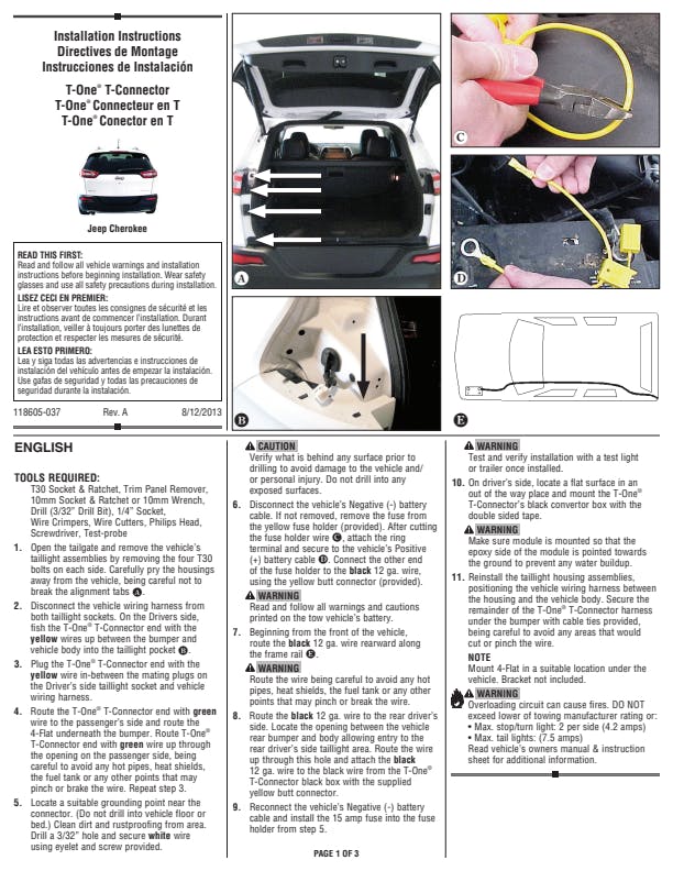 T-One Connectors require no splicing of vehicle wires. Simply locate your vehicles wiring harness connector, unplug the connection and insert the T-One Connector into the vehicle's harness. No special tools required. Factory appearanceQuick and easy installationSolid, weatherproof, one-piece constructionNo cutting, splicing or taping of vehicle wiresIncludes converter where needed16 gauge bonded wire with 4-Flat plug & capStop/Turn circuit capacity of 4.2 AmpsTaillight circuit capacity of 7.5 Amps1 year limited warrantyStop/Turn circuit capacity of 4.2 Amps