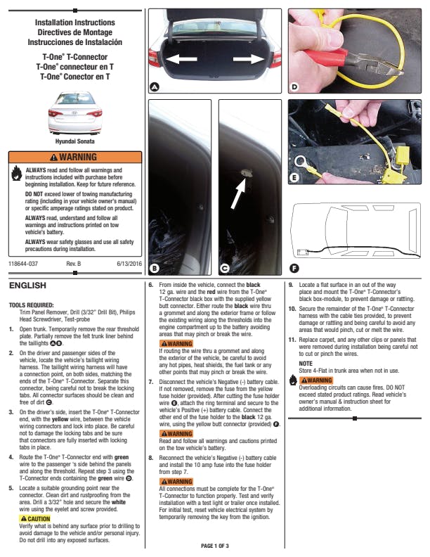 T-One Connectors require no splicing of vehicle wires. Simply locate your vehicles wiring harness connector, unplug the connection and insert the T-One Connector into the vehicle's harness. No special tools required. Factory appearanceQuick and easy installationSolid, weatherproof, one-piece constructionNo cutting, splicing or taping of vehicle wiresIncludes converter where needed16 gauge bonded wire with 4-Flat plug & capStop/Turn circuit capacity of 4.2 AmpsTaillight circuit capacity of 7.5 Amps1 year limited warrantyStop/Turn circuit capacity of 2.1 Amps