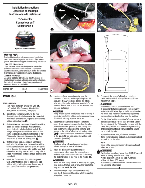 T-One Connectors require no splicing of vehicle wires. Simply locate your vehicles wiring harness connector, unplug the connection and insert the T-One Connector into the vehicle's harness. No special tools required. Factory appearanceQuick and easy installationSolid, weatherproof, one-piece constructionNo cutting, splicing or taping of vehicle wiresIncludes converter where needed16 gauge bonded wire with 4-Flat plug & capStop/Turn circuit capacity of 4.2 AmpsTaillight circuit capacity of 7.5 Amps1 year limited warrantyStop/Turn circuit capacity of 4.2 Amps