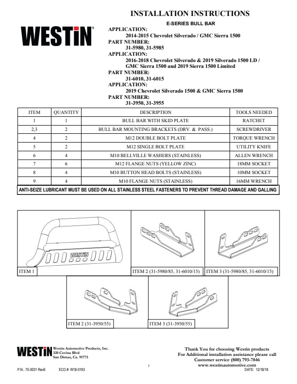 Westin 31-3950 E-Series Bull Bar fits 2019-2021 Silverado 1500, 2023-2024 Silverado 1500 & 2022 Silverado 1500 LTD (Exc 2019 LD) Stainless Steel |
