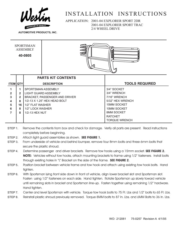 Westin 40-0805 Sportsman Grille Guard fits 01-04 Explorer Sport 01-06 Sport Trac |